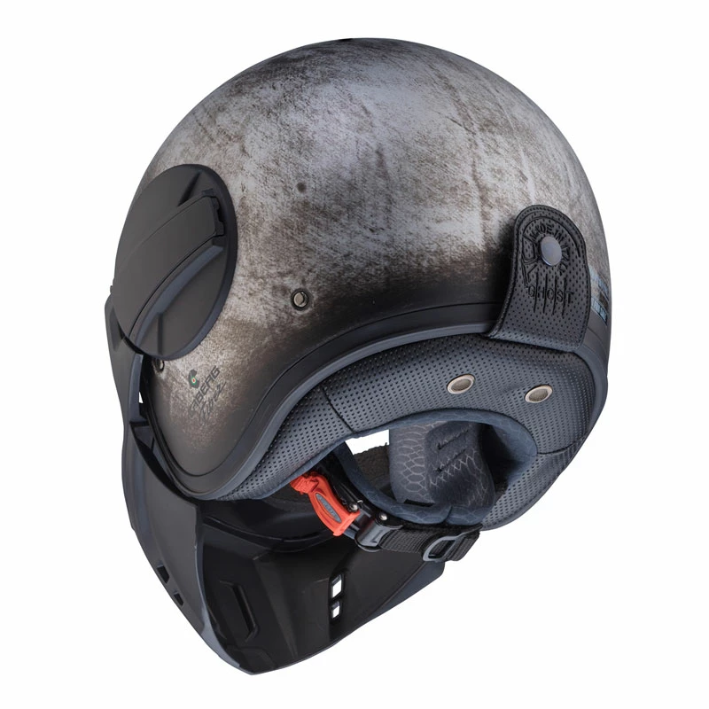 Forma e stile aggressivo si uniscono ad una funzionalità e praticità unica sul mercato. Questo jet è infatti equipaggiato con una particolare visiera a forma di occhiale che aderisce al viso grazie alla spugna presente sul profilo inferiore della stessa, oltre ad una maschera che protegge il viso dagli agenti atmosferici e dagli insetti. Grazie ad un meccanismo basculante a molle, il movimento di apertura e chiusura della visiera completa di maschera è semplice e intuitivo e può essere fatto con estrema facilità utilizzando solo una mano, a differenza dei caschi Jet con occhiali e maschere con semplici elastici.