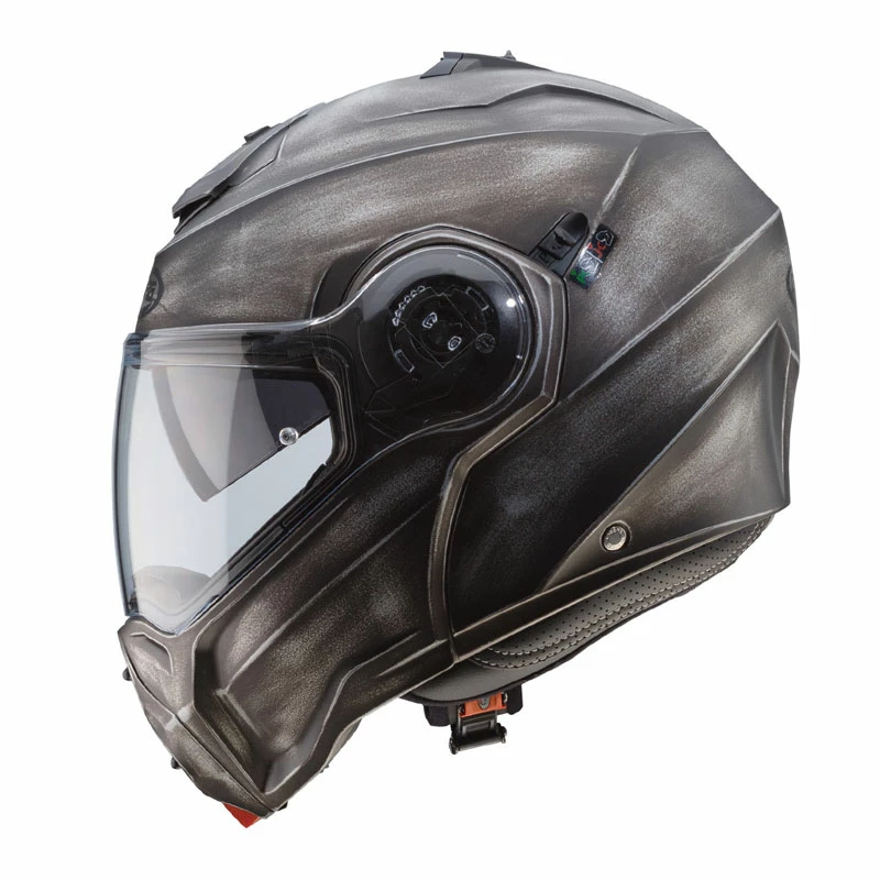 Droid è il nuovo apribile di casa caberg 100% made in italy dotato di soluzioni tecniche innovative, design estremamente aggressivo e spiccata personalità per i motociclisti che non vogliono passare inosservati. La mentoniera frontale presenta due grandi prese d’aria regolabili individualmente che convogliano l’aria sulla visiera, evitando l’appannamento nelle condizioni climatiche più estreme. L’aerazione interna è garantita inoltre da una grande presa d’aria frontale regolabile e dai canali presenti nella calotta interna del casco. Frutto dell’esperienza maturata dalla prima azienda italiana ad aver prodotto caschi apribili, Il nuovo DROID è dotato della doppia omologazione P/J che permette di guidare anche a mentoniera alzata sempre in sicurezza grazie al selettore posizionato sulla sinistra del casco che, nella posizione J, blocca la mentoniera nella posizione di massima apertura evitando così la chiusura accidentale della stessa. Grazie alle ridotte dimensioni del casco, il peso del nuovo DROID è di solo 1550 +-50 gr.