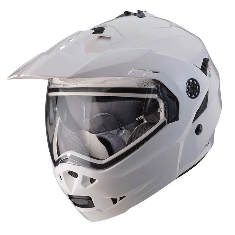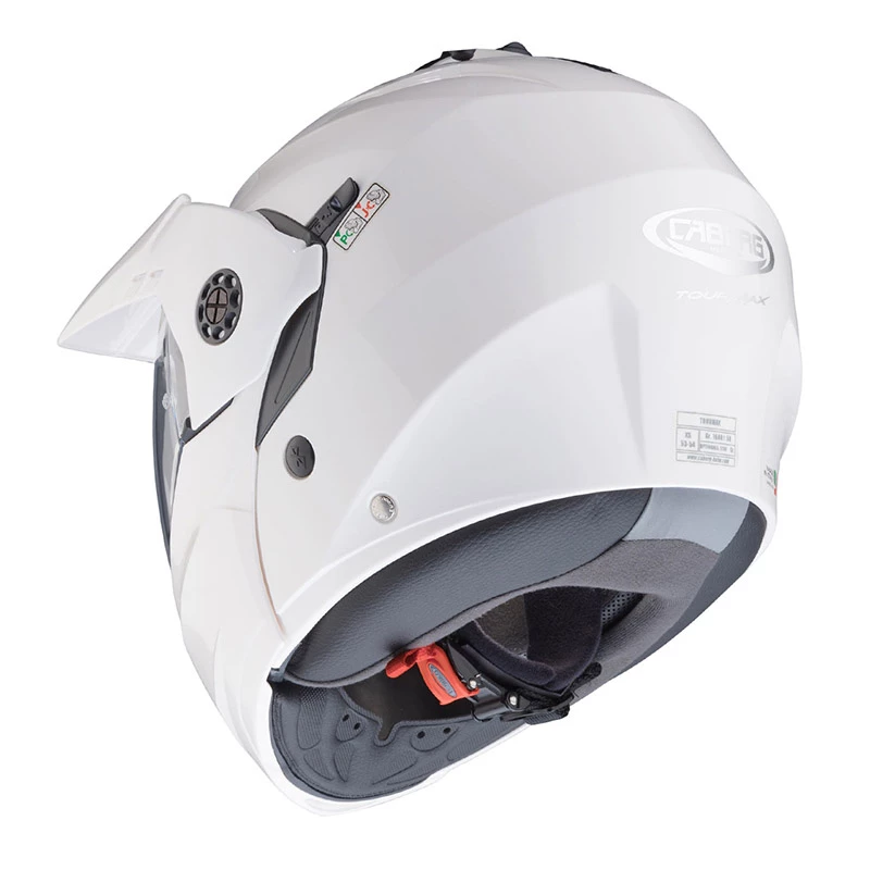 Tourmax è il primo casco apribile Adventure sul mercato pensato per tutti i possessori di motociclette Enduro e Maxi Enduro. Frutto dell’esperienza maturata dalla prima azienda italiana ad aver prodotto caschi apribili, Il nuovo TOURMAX 100% Made in Italy, è dotato di un frontino che automaticamente si avvicina alla visiera quando viene aperta la mentoniera per ridurre al mas – simo la resistenza all’aria. Tourmax, è dotato di doppia omologazione P/J che permette di guidare anche a mentoniera alzata sempre in sicurezza grazie al selettore posizionato sulla sinistra che, nella posizione J, blocca la mentoniera nella posizione di massima apertura evitando così la chiusura accidentale della stessa. Tourmax è dotato dell’esclusivo sistema DoubleVisorTech che grazie ad una visiera parasole integrata facile da manovrare, permette di guidare sempre con la giusta luce e quindi con la massima sicurezza. La visiera parasole è resistente al graffi, mentre quella esterna trasparente non solo al graffi o ma anche all’appannamento grazie alla doppia lente Pin lock. La ven – tilazione è garantita da due ampi aeratori facili da manovrare anche con i guanti posizionati sulla mentoniera e sulla parte superiore della calotta che attraverso una serie di canali interni assicurano un ottimo ricambio d’aria interno. L’interno è completamente amovibile e lavabile con inserti posteriori rifrangenti, realizzato con tessuti traspiranti ed ipoaller – genici per garantire la massima freschezza ed igiene. Tourmax è offerto nei colori nero opaco, antracite opaco, bianco metallizzato oltre alla sportiva versione grafica SONIC realiz – zata su base bianca. All’interno del nuovo Tourmax può essere alloggiato il sistema di comunicazione JUST SPEAK EASY che permette di comu – nicare non solo con il proprio telefono cellulare e con il proprio passeggero ma anche di collegarsi ad un GPS ed ascoltare musica attraverso il telefono o un lettore Mp3. JUST SPEAK EASY è dotato di profilo Bluetooth A2DP che permette l’ascolto in alta qualitĂ stereo. Calotta esterna: Policarbonato. Interno: Completamente estraibile e lavabile trattato santized con rifrangente posteriore. Stop Wind mentoniera amovibile. Ventilazione: Aeratore mentoniera per evitare condensa sulla visiera. Aeratore superiore regolabile per un migliore riciclo d’aria. Visiere: Double Visor Tech. Visiera trasparente antigraffio con Pin lock di serie. Visiera parasole antigraffio. Sistema di ritenzione: Fibbia a regolazione micrometrica.